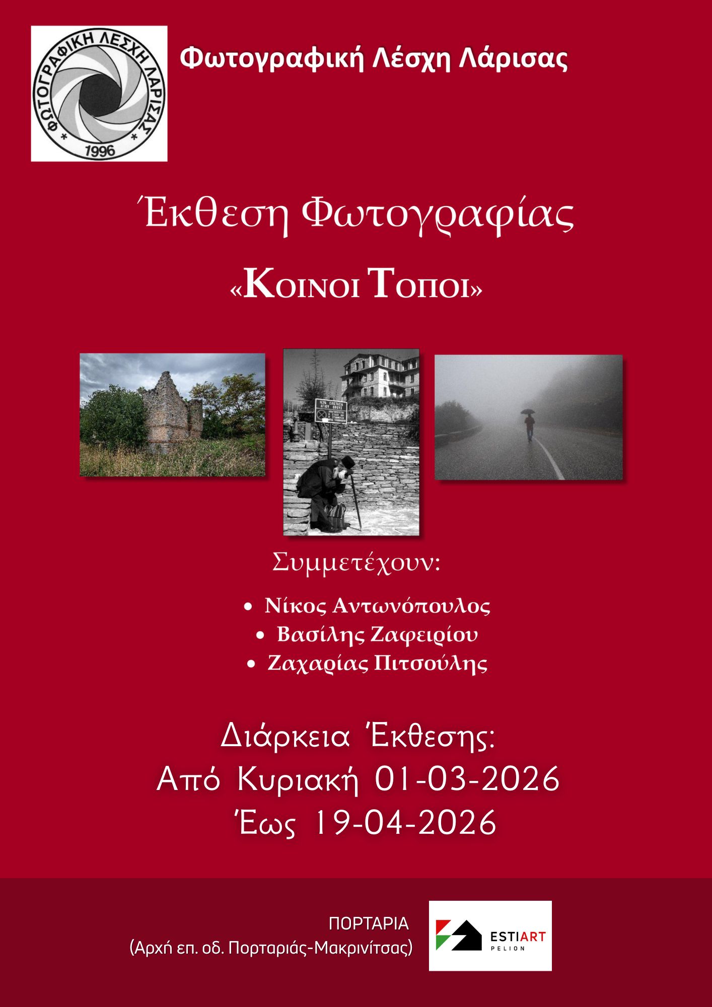 Τρεις διαφορετικές φωτογραφικές ματιές συναντιούνται σε έναν κοινό τόπο έκφρασης, εγκαινιάζοντας έναν δημιουργικό διάλογο στο Esti Art Pelion στην Πορταριά. Την Κυριακή 1 Μαρτίου ανοίγει η έκθεση “Κοινοί Τόποι” της Φωτογραφική Λέσχη Λάρισας, με έργα των Νίκου Αντωνόπουλου, Βασίλη Ζαφειρίου και Ζαχαρία Πιτσούλη.