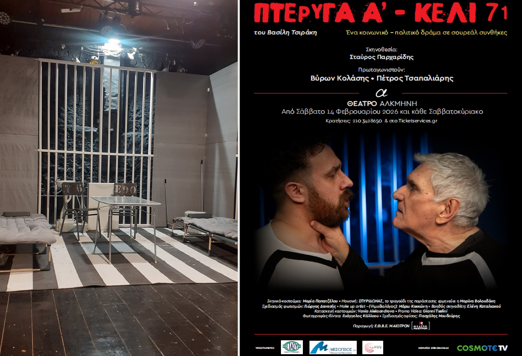 Από το Σάββατο 14 Φεβρουαρίου στο Θέατρο Αλκμήνη και κάθε Σάββατο στις 21:30 και Κυριακή στις 18:00, θα παρουσιάζεται η παράσταση «Πτέρυγα Α’ – Κελί 71», του Βασίλη Τσιράκη, σε σκηνοθεσία Σταύρου Παρχαρίδη.