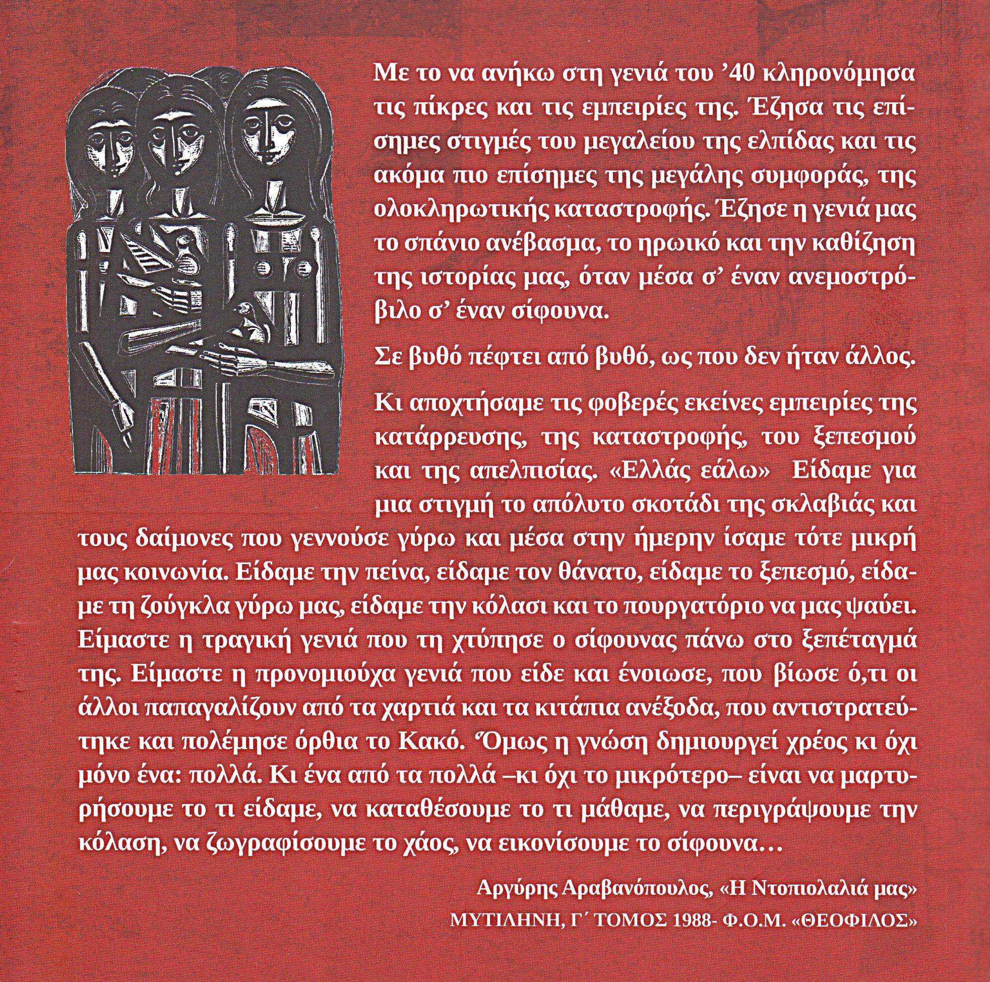 Το βιβλίο έχει ως κατακλείδα την ονομαστική κατάσταση όλων των Λέσβιων που έχασαν τη ζωή τους κατά τη δεκαετία 1940-1949 και που ανέρχονται στους 1180 !!!