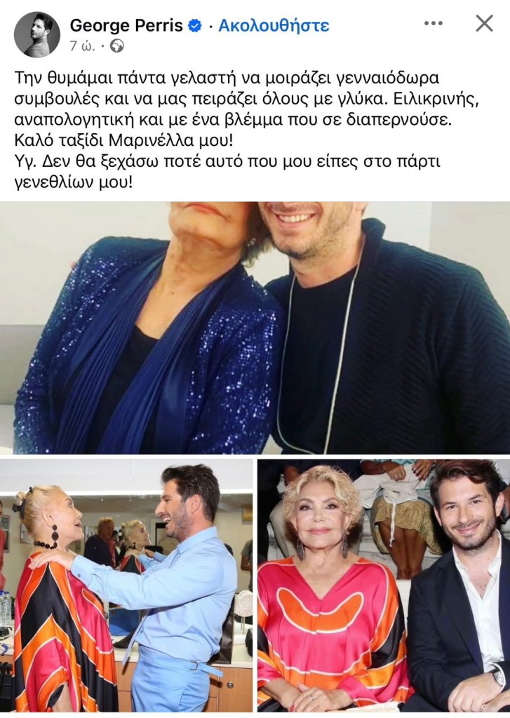 Ο Γιώργος Περρής τη θυμάται «πάντα γελαστή», με γενναιοδωρία και ζεστασιά, σημειώνοντας την ειλικρίνεια και το ιδιαίτερο βλέμμα της, ενώ αποχαιρετά με τη φράση «καλό ταξίδι».