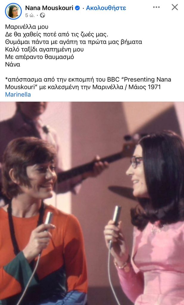 Η Νάνα Μούσχουρη αποχαιρετά τη Μαρινέλλα με προσωπικό τόνο, σημειώνοντας ότι «δεν θα χαθεί ποτέ από τις ζωές μας» και θυμάται με αγάπη τα πρώτα τους βήματα.