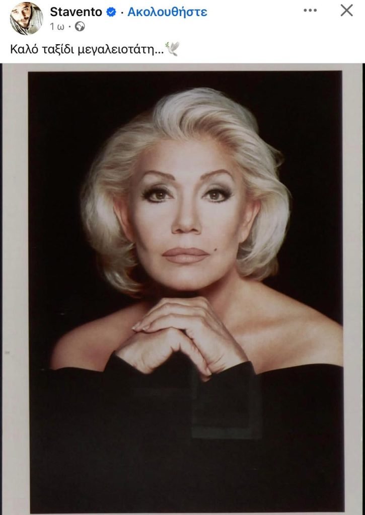 Οι Stavento αποχαιρετούν τη Μαρινέλλα με μία λιτή αλλά φορτισμένη ανάρτηση, γράφοντας «Καλό ταξίδι μεγαλειότατη», αποτυπώνοντας τον σεβασμό και την αναγνώριση προς μια εμβληματική μορφή του ελληνικού τραγουδιού.