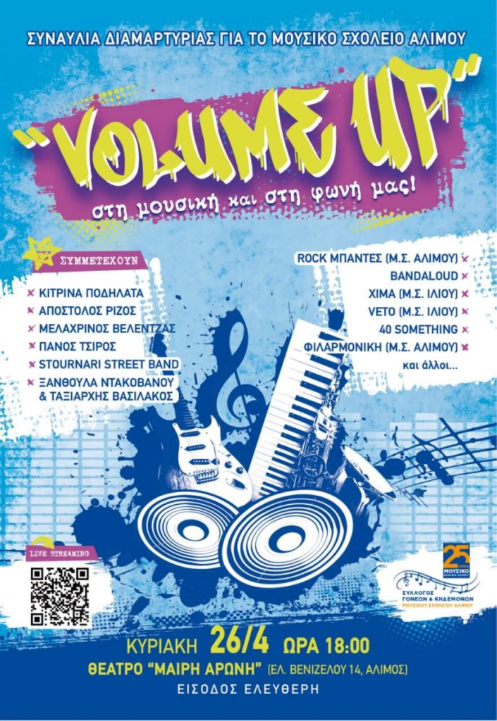Η εκδήλωση, με τίτλο «VOLUME UP», θα πραγματοποιηθεί την Κυριακή 26 Απριλίου στις 19:00, στο Θέατρο «Μαίρη Αρώνη» στον Άλιμο με ελεύθερη είσοδο, ενώ η συναυλία θα μεταδοθεί απευθείας και μέσω διαδικτύου.