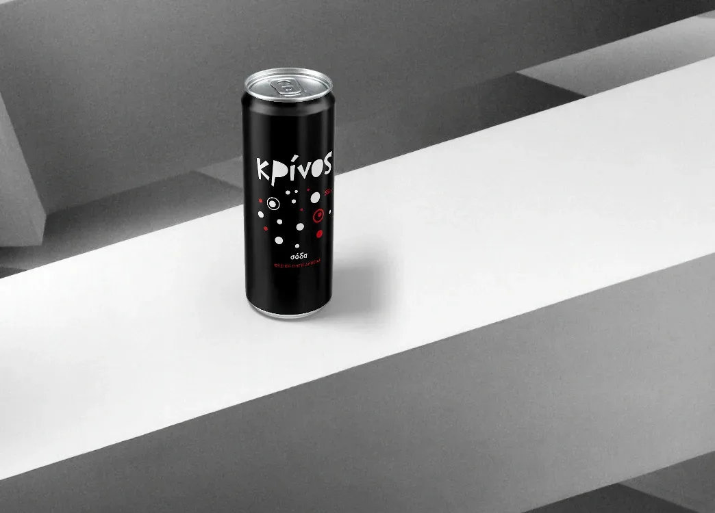Ένα υπέροχο μαύρο sleek can που ξεχωρίζει με το minimal ματ φινίρισμα του που αποπνέει κομψότητα και σύγχρονο στύλ! Διακριτικό και συνάμα πολύ δυνατό! Τα λευκά και κόκκινα γραφικά στοιχεία, εμπνευσμένα από τη φυσική κίνηση των φυσαλίδων, αποτυπώνουν με δημιουργικό τρόπο τη δροσιά και την ποιότητα που θα γευτείτε ανοίγοντας την Σόδα ΚΡΙΝΟΣ. Η μοντέρνα τυπογραφία του λογοτύπου ενισχύει την αναγνωσιμότητα, ενώ οι διακριτικές λεπτομέρειες υπογραμμίζουν τον premium χαρακτήρα της συσκευασίας.