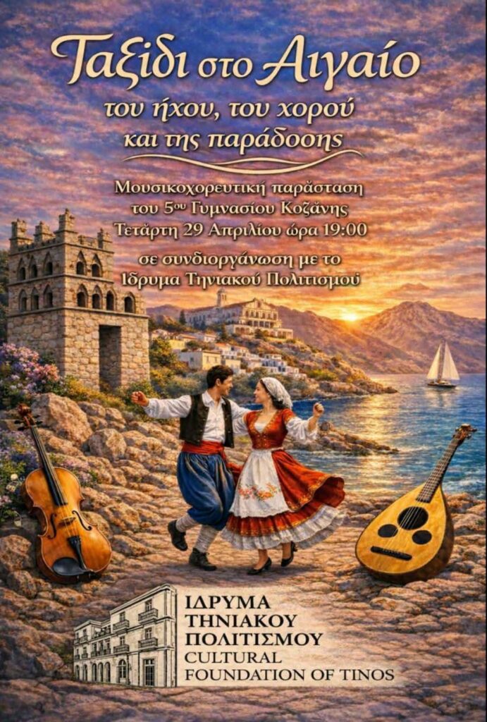 Το 5ο Γυμνάσιο Κοζάνης παρουσιάζει τη μουσικοχορευτική παράσταση «Ταξίδι στο Αιγαίο του ήχου, του χορού και της παράδοσης», την Τετάρτη 29 Απριλίου και ώρα 19:00, στο Ίδρυμα Τηνιακού Πολιτισμού, στην Αίθουσα «Νικηφόρος Λύτρας», σε συνδιοργάνωση με το Ίδρυμα.