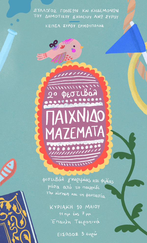 Ο Σύλλογος Γονέων και Κηδεμόνων του δημοτικού σχολείου Άνω Σύρου διοργανώνει με το ΚεΠεΑ Σύρου Ερμούπολης το 2ο Φεστιβάλ «Παιχνιδομαζέματα», την Κυριακή 10 Μαΐου, από τις 11 πμ έως τις 7 μμ, στην έπαυλη Τσιροπινά. Ένα φεστιβάλ γνωριμίας και φιλίας μέσα από το παιχνίδι, την κίνηση και τη φαντασία.